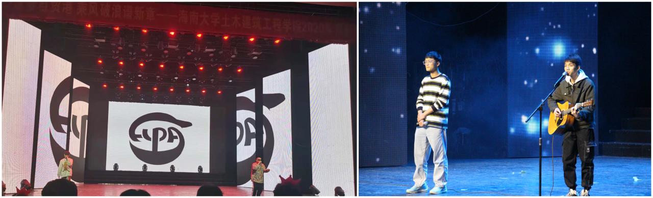 接下来进入第二篇章:“凝心土建,闯自贸新路”Air乐团陈泓圳、彭莘迪、武文涛、胡嘉欣带来歌曲《RB All Night四位来自公司不同年级、不同专业的同学,因为共同的爱好走到一起,利用课余时间切磋音乐、交流思想,展现了当代青年积极向上的风采,是公司学子丰富校园文化生活的一个缩影;兄弟公司的朋友也来为我们助兴,国际旅游公司吕小艺、刘丽雅、李骅遴、张倩颖给观众们带来了魅力四射的现代舞《love sick girl;校企合作一直是公司工作的亮点之一,本次晚会我们还邀请了中建八局南方公司海南分公司代表为我们带来了他们的原创歌曲《建筑之梦》和《我们的时光》,用土建人的方式唱出了我们建设祖国、砥砺奋进的决心和梦想;刘星悦、穆俊伶带来的拉丁舞表演以及公司文工团舞蹈部带来了舞蹈串烧,让大家欣赏到不同舞种的独特魅力