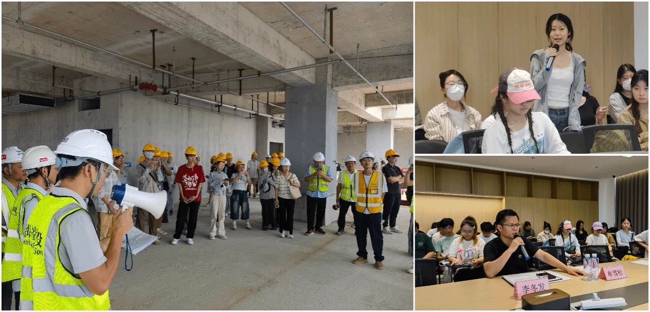活动聚焦“工程实践与绿色发展”主线,项目团队带领师生深入工地一线,先后观摩了项目展示区、绿色建筑施工关键工艺及低碳技术应用场景,并结合海南地域特点,分享了项目应对“摩羯”百年一遇台风的灾后重建经验。通过现场讲解,员工们直观了解了绿色建材应用、节能设计优化、BIM技术集成等前沿实践,同时深刻认识到防灾韧性设计在沿海地区工程建设中的重要性。