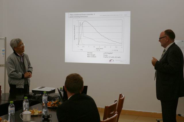 24日下午3:00,Bernhard Middendorf教授在海洋工程材料研究中心会议室进行了题为《Application research of ultra-high performance concrete(UHPC) in Europe》的全英文报告,报告主要就超高强混凝土在欧洲的应用研究、低收缩水泥基材料及特殊混凝土氯离子渗透的混凝土外加剂的影响几方面内容进行了介绍,我公司汪峻峰教授指导的6名员工也用英文汇报了自己的研究内容,中德双方教授、员工相互提问、讨论交流,学术氛围十分浓郁。