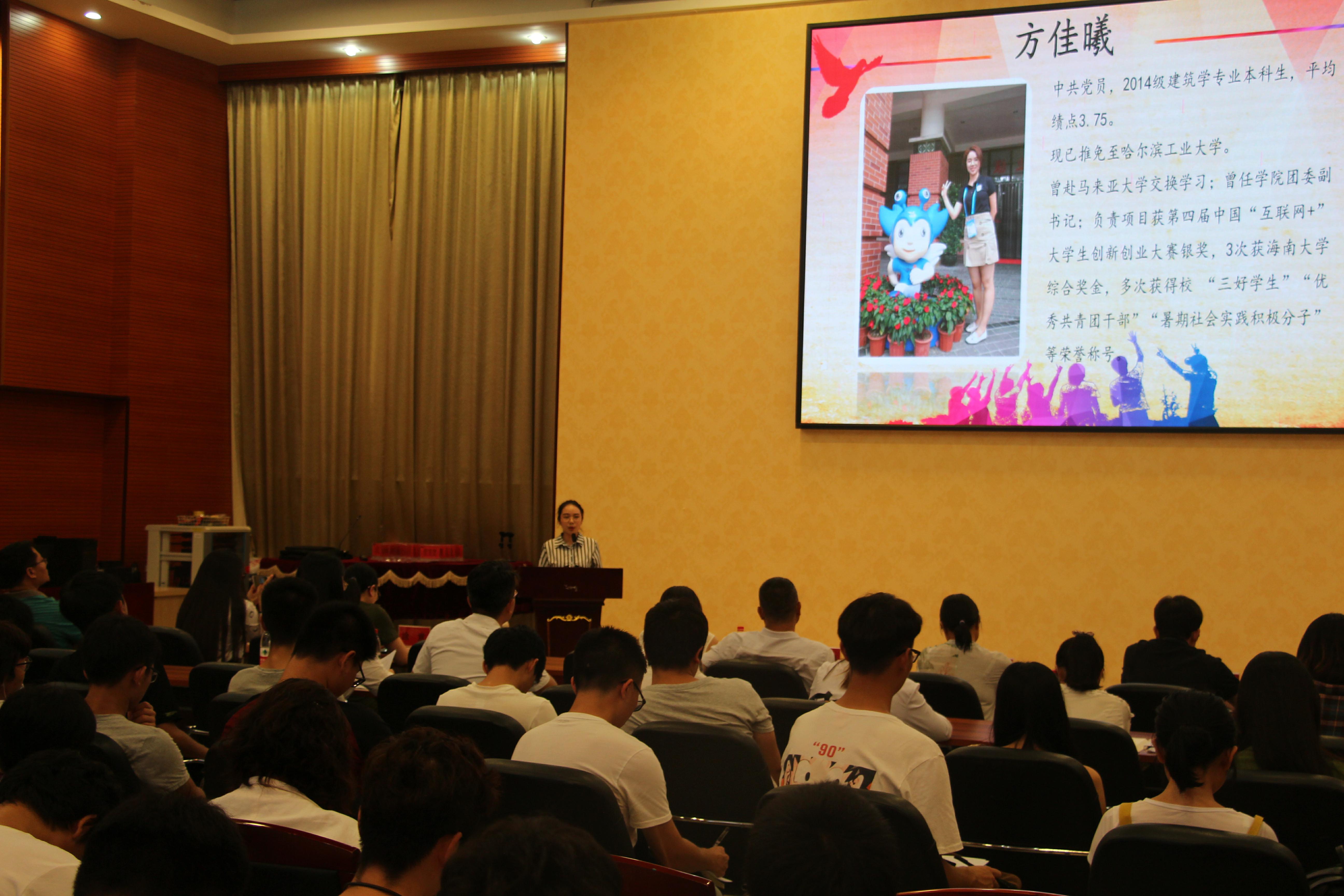 首先通过宣传片让大家对今年评选出的9位优秀学子有了初步认识。接下来,4位“土建榜样”一一进行成长汇报并回答观众提出的问题。2017级岩土工程专业研究生吴雨薇分享自己入学初便制定了学习规划,并讲述了实习实践的经历和担任公司研究生员工会主席的经历;2014级建筑学专业本科生方佳曦曾任公司团委副书记,她分享了做员工干部的成长收获,讲述了赴马来亚大学交换学习的经历、参加第四届中国“互联网+”老员工创新创业大赛的经历等;2016级土木工程专业本科生马倩倩汇报了她在台湾中原大学交换学习和在美国参加志愿者实习项目的经历,讲述了自己明确目标、奋发努力的故事;2016级土木工程专业施杰分享了自己科研学习历程,鼓励同学们主动跟随老师做科研,在科研中锻炼意志、培养能力,从而厚积薄发。