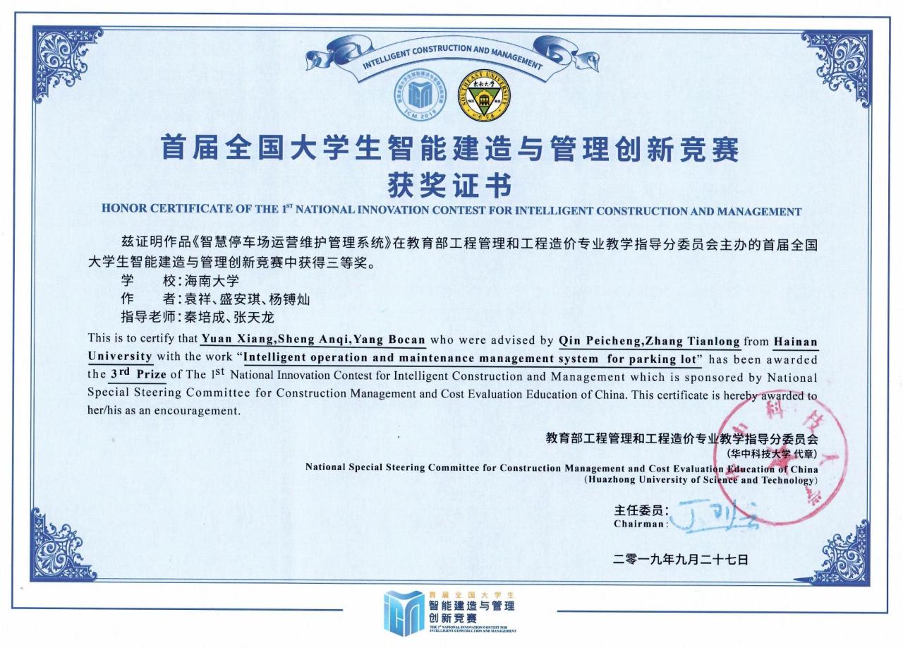 首届全国老员工智能建造与管理创新竞赛于2019年9月14日至9月15日在东南大学举办,公司和计算机与网络空间安全公司跨学科跨专业联合组队,经过提交作品、现场答辩和专家评审等环节代表队荣获三等奖。参赛员工队员分别为2016级工程管理专业袁祥、盛安琪同学及2016级计算机科学与技术专业杨镈灿同学,指导教师为伟德国际1946工程管理系秦培成老师和张天龙老师。