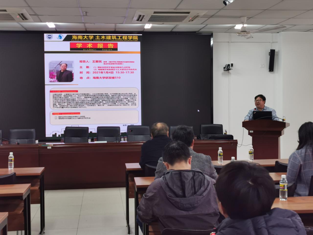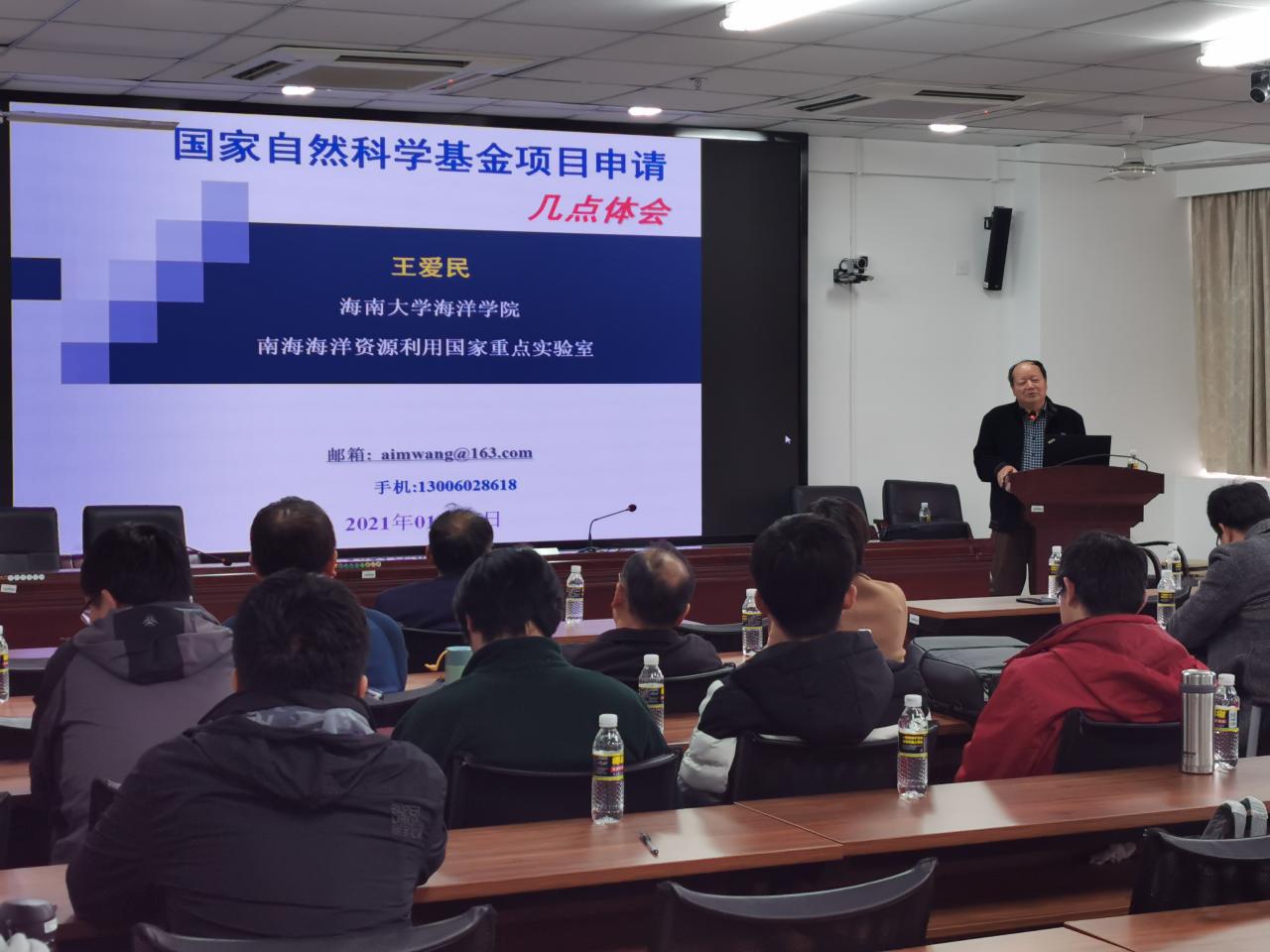 2021年1月4(周一)下午3:30-6:00点伟德BV1946官网海洋公司/南海海洋资源利用国家重点实验室海洋牧场团队负责人王爱民教授应公司周智经理的邀请,在研发楼510报告厅为公司拟申报2021年国家自然科学基金的老师做了题为《国家自然科学基金申报的几点体会》和《海南海洋牧场建设与土木建筑合作的机会》学术报告。报告会由周智经理主持,我院拟申报2021年国家自然科学基金的教师近30人参加了此次学术报告会。
