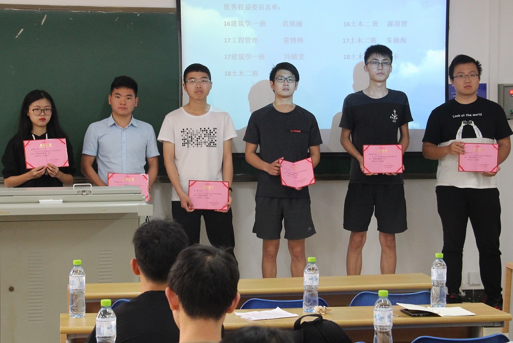 首先,罗成秀以“卖年糕”等维权事件为例介绍权益自律部在过去的半个学期的具体工作及主要维权成果。之后,权益自律部分别向16级建筑学范旭丽、16级土木二班郝迎智、17级工程管理董博帅、17建筑学一班冯靖雯、17级土木二班朱勋海、18级土木一班卞卡、18级土木二班曹乾七位权益委员颁发优秀权益委员证书。大会中,17级董博帅同学为大家分享了他大一时作为权益自律部干事时处理一位学姐在图书馆一楼复习受到中日友好交流中心附近噪音影响后与工作人员发生冲突的事件时遇到的困难,后来他灵活的运用权益知识,事情得到圆满的解决;他提到权益委员要积极配合权益自律部的工作,努力维护公司里同学们的合法权益。大会最后,罗成秀总结了权益自律部在上半年独立完成的和与伟德BV1946官网员工会合作完成的维权事件。罗成秀提到还存在细节维权事件较少,与公司的同学不能及时沟通之类的问题,需要权益委员们和权益部门的共同努力,争取早日解决。