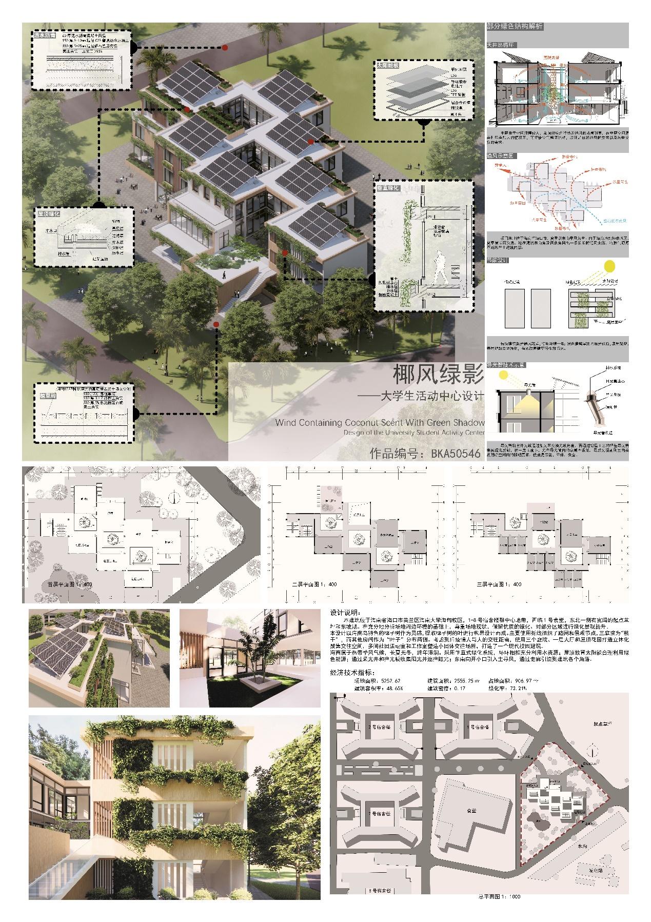 本设计以海南岛特色的椰子树作为灵感,提取椰子树的叶进行构思设计而成。主要使用折线组织了路网和景观节点,三庭院为“枝干”,而其他房间作为“叶子”分布两侧。考虑到后疫情人与人的交往距离,使用三个庭院、一层大厅和屋顶花园打造立体化聚集交往空间,多间社团活动室和工作室塑造小团体交往场所,打造了一个现代校园建筑。